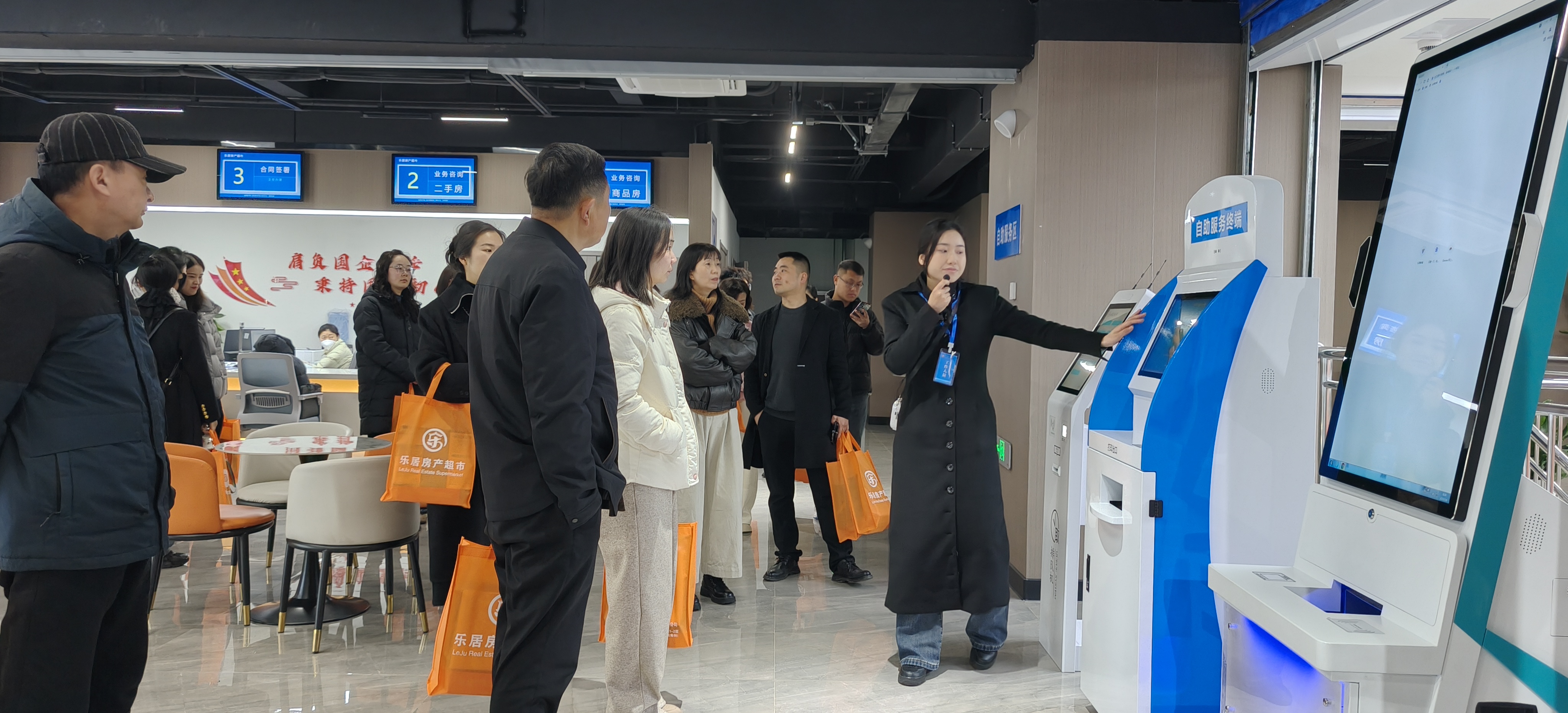 活動人員參觀樂居房產(chǎn)超市,期間工作人員介紹了樂居房產(chǎn)超市的功能布局。政務(wù)集成服務(wù)區(qū)實現(xiàn)不動產(chǎn)登記、稅費繳納等多項業(yè)務(wù)快速辦理,智能自助終端讓購房者享受"指尖上"的便捷;沙盤展示區(qū)生動呈現(xiàn)樓盤規(guī)劃藍(lán)圖;二手房專區(qū)專業(yè)人員提供專業(yè)服務(wù);金融服務(wù)區(qū)創(chuàng)新推出多種產(chǎn)品矩陣;抖音直播間與線上平臺構(gòu)建起"全天候"購房生態(tài)。工作人員全程專業(yè)講解,"全周期、全要素、全鏈條"的"一站式房產(chǎn)服務(wù)平臺"新模式令參觀者深切感受到國企改革創(chuàng)新的澎湃動能。