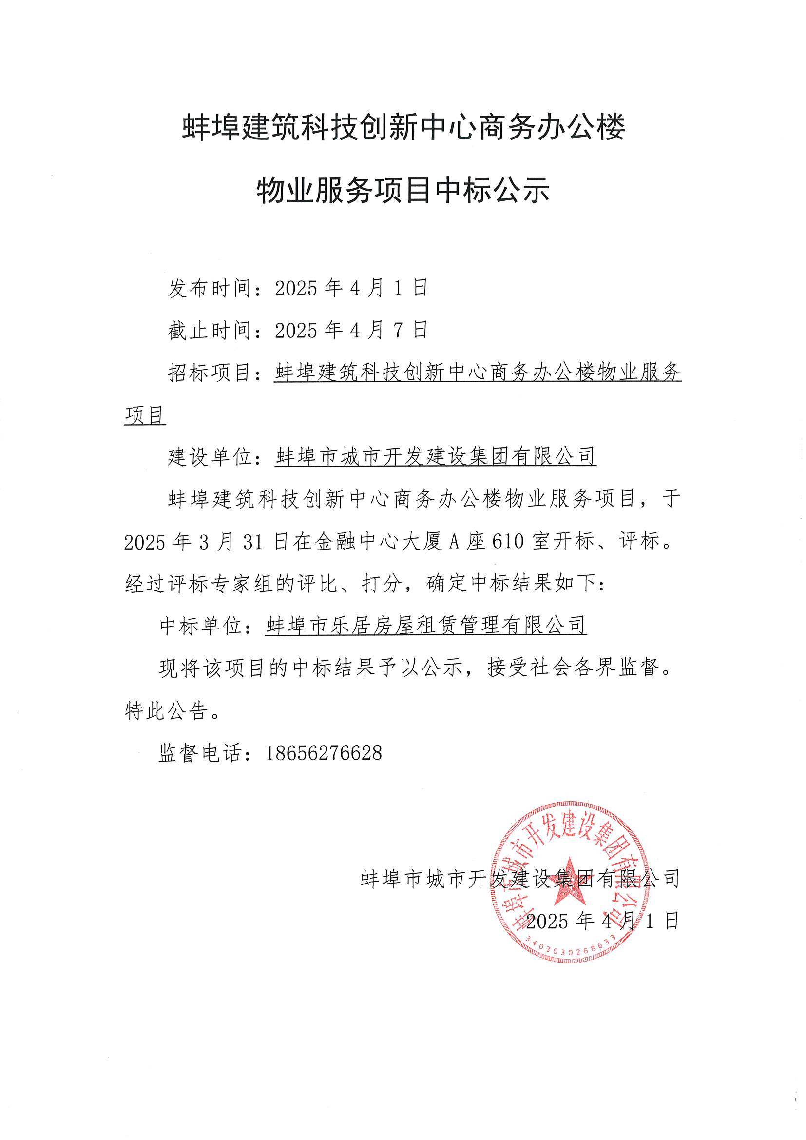 蚌埠建筑科技創(chuàng)新中心商務辦公樓物業(yè)服務項目,于2025年3月31日在金融中心大廈A座610室開標、評標。經(jīng)過評標專家組的評比、打分,確定中標結果如下: