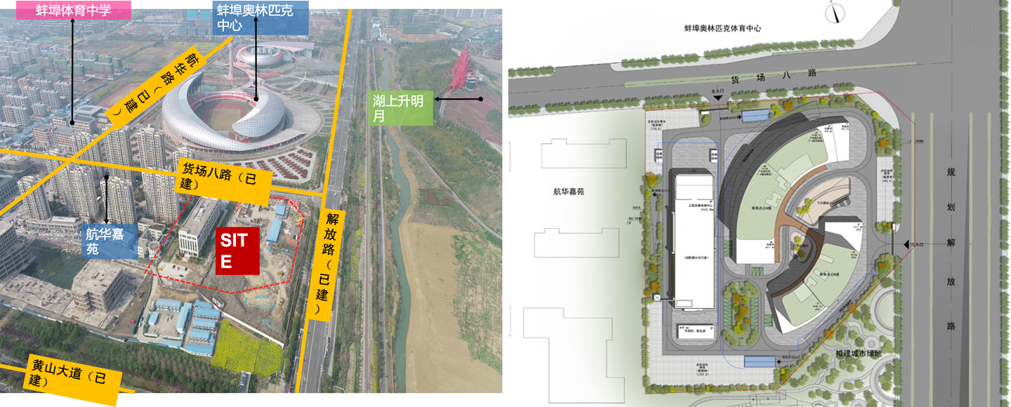 項目選址于蚌埠市蚌山區(qū),南側(cè)緊鄰黃山大道,北鄰貨場八路,東側(cè)解放路。項目北側(cè)為蚌埠奧林匹克中心,南側(cè)為城市公園,西側(cè)為航華佳苑小區(qū),東側(cè)與湖上升明月隔解放路相望。